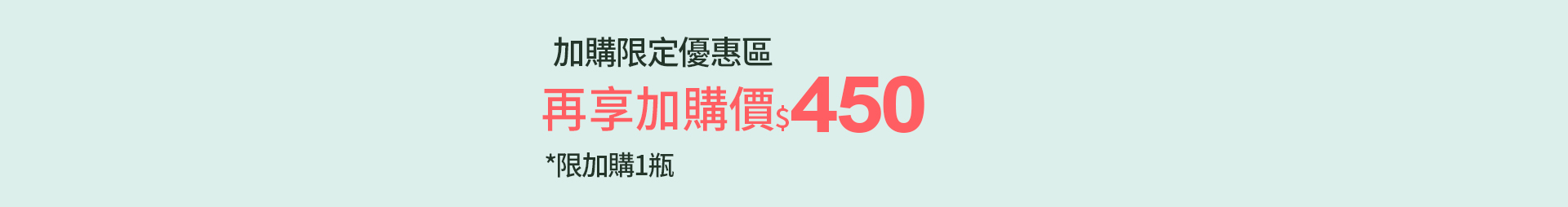 .會員首購限定,凡加入官網會員即可購買,每人限購一次。 .相同姓名、地址、電話、EMAIL視為同一人。 .本公司保留活動變更之權利。 .此為特惠價格,恕不參加滿額折、滿額贈活動。 .加購限定優惠區,再享加購價$450,限加購一瓶。
