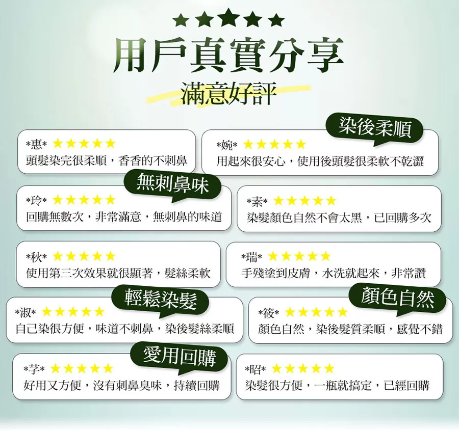 ✘ 不使用:氧化劑、PPD、PTD、酯類防腐劑、焦油染料、雙氧水